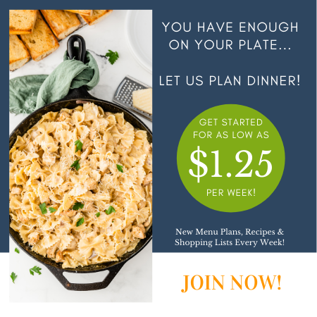 Join the MenuPlans.com Family Today and get access to our weekly menu plan and shopping list featuring all our best recipes! It makes getting dinner on the table for your family each night SO EASY!