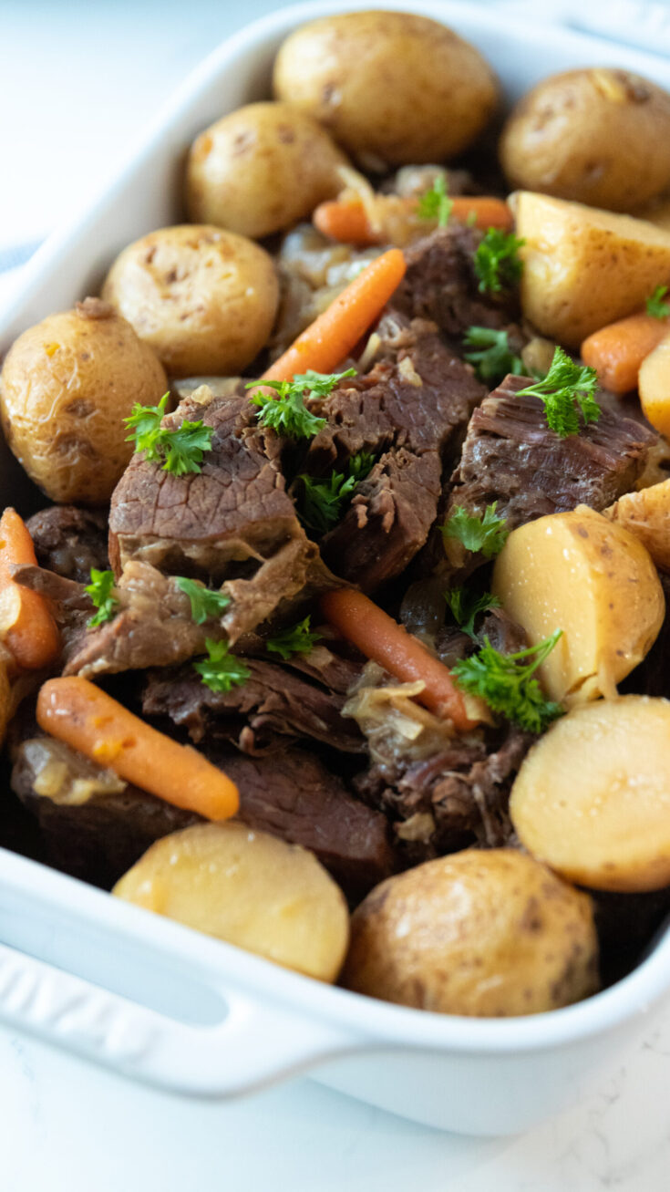 This pot roast has potatoes, carrots, onion soup mix, onions and more. You can whip up this pot roast for your family or even to serve a crowd.