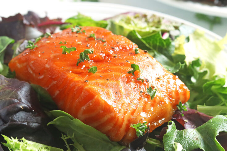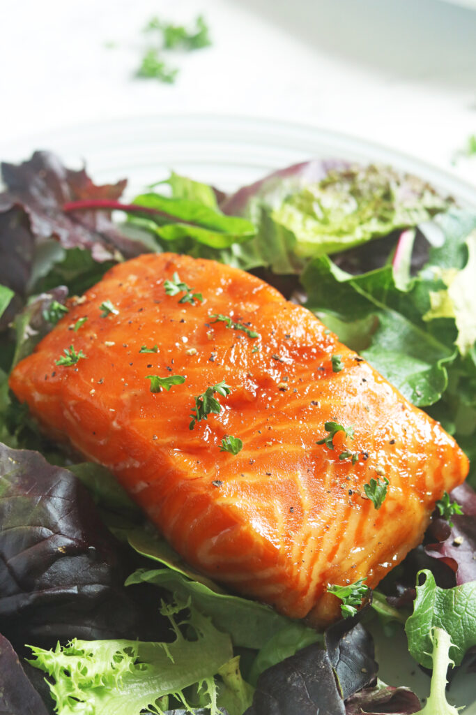The easy teriyaki marinade is so flavorful and the maple syrup adds a slight hint of sweetness. This salmon may be served on a bed of greens or with any veggies of your choice!