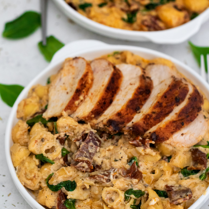 Tuscan chicken mac and cheese is one of my family’s favorites. The sun dried tomatoes, spinach leaves, and varieties paired with the cheese blend just works so well together.